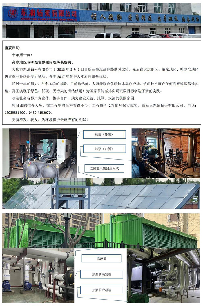 大慶市東油鉆采有限公司的地?zé)岷吞柲苋∨鉀Q方案(2023年6月15日發(fā)布)